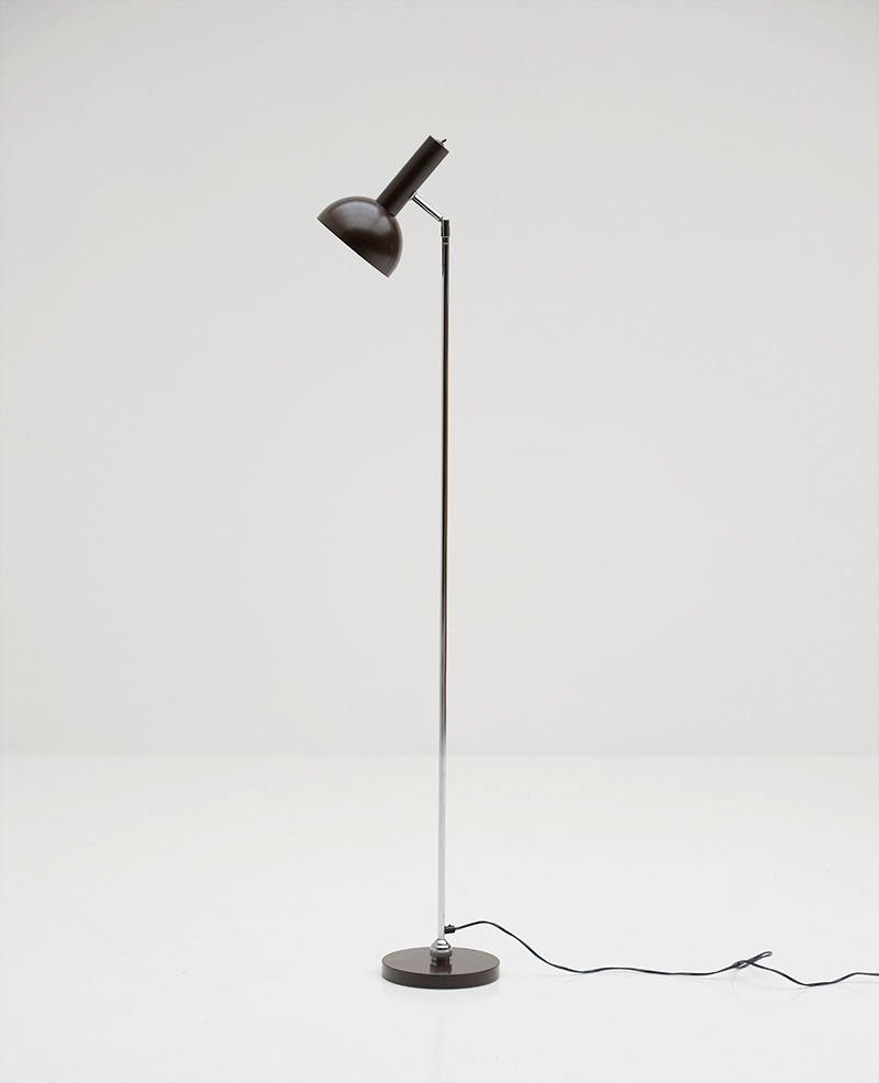 Decorative seventies floorlamp with a dark brown lacquered shade and chrome base. The pivoting lamp can be moved to all directions due to the ball in socket joint on the floor plate. The top hood can be moved around, as well as up and down. This lamp contains in excellent condition.
