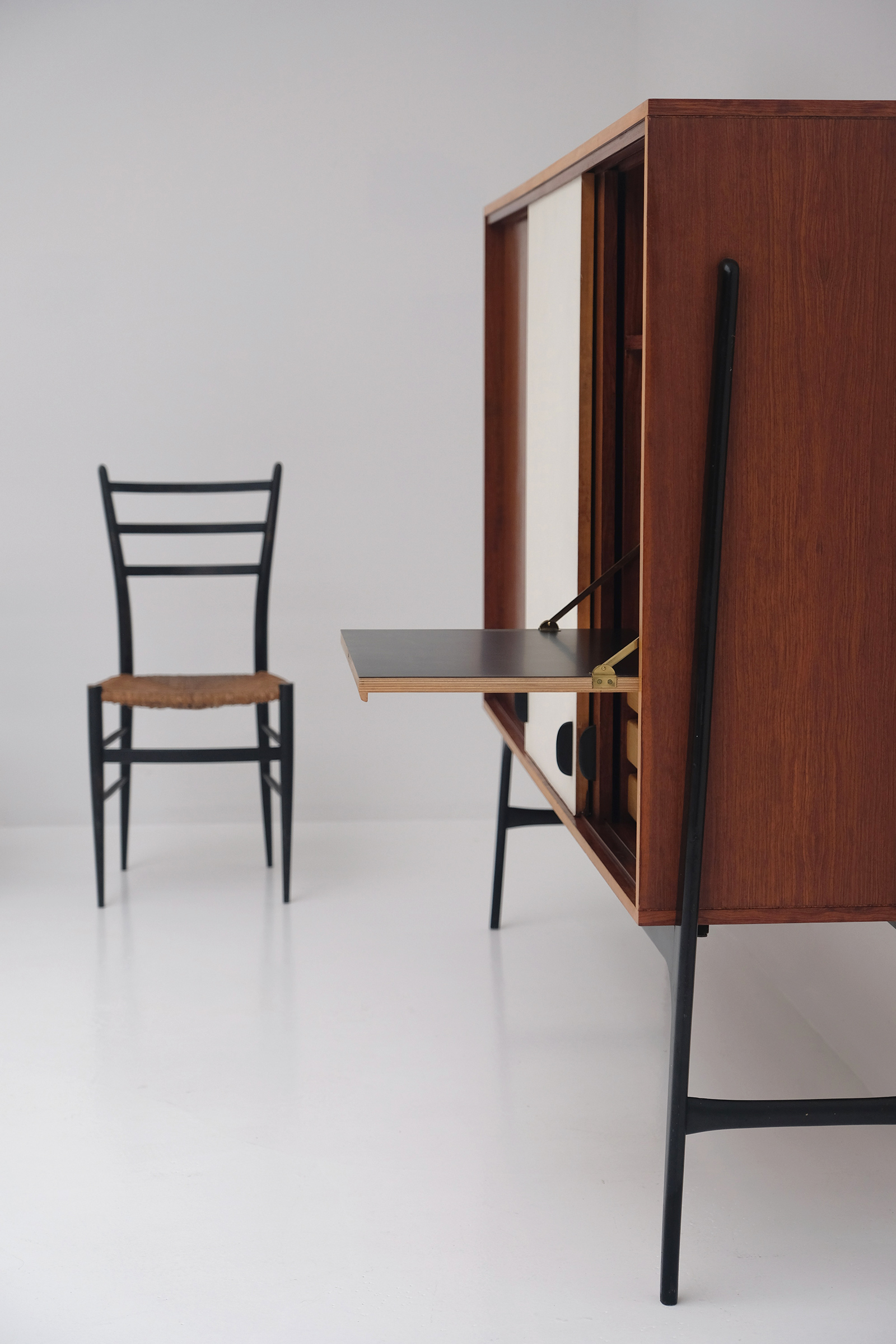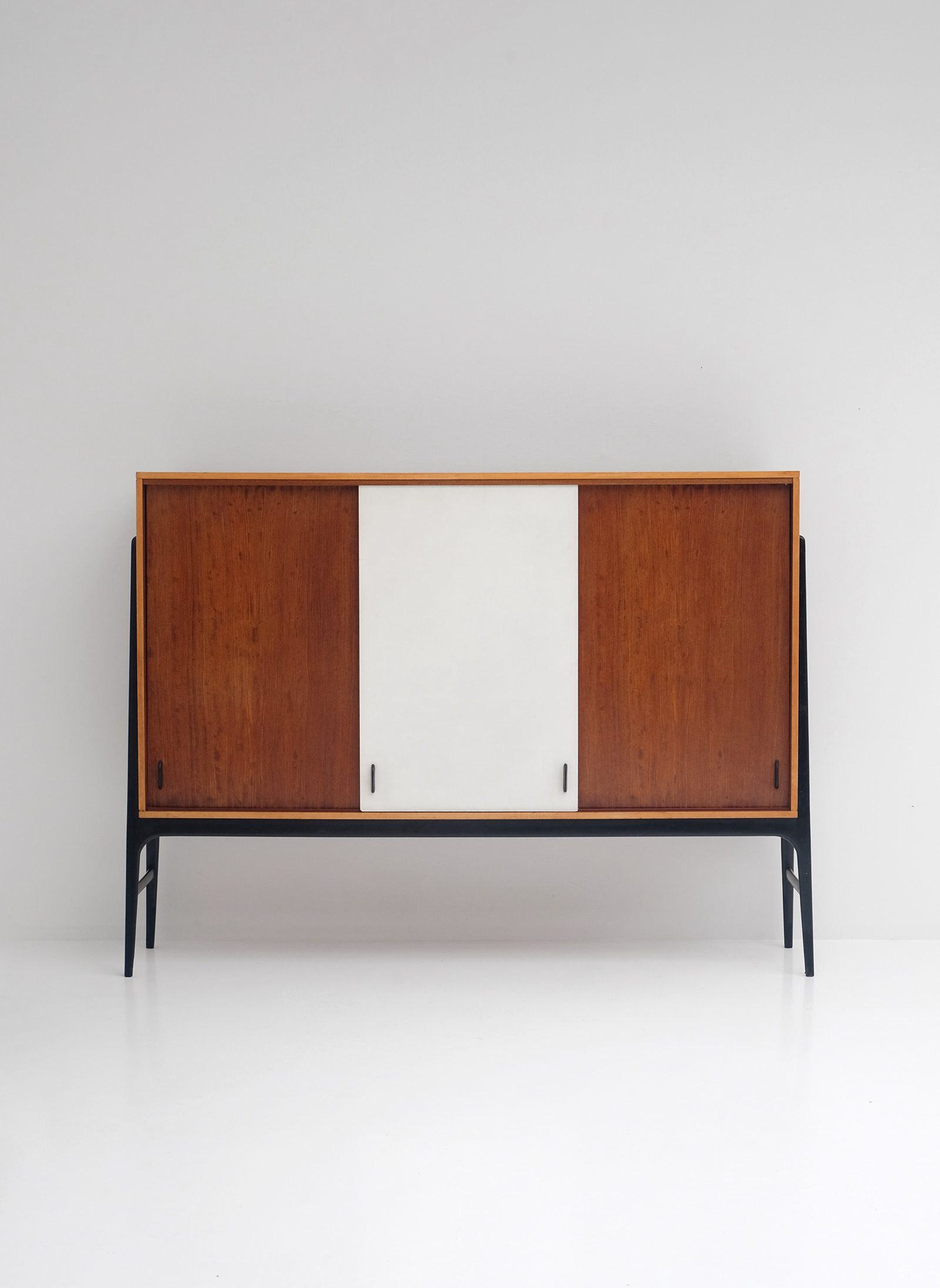 Rare highboard designed by Alfred Hendrickx for Belform in the 1950s. This item is beautiful in its design and details. behind the three sliding doors you find three drawers and a secretaire, all well kept and nicely detailed. The buffet is build out of a Mahogany laminate and has a black lacquered wooden frame that also contains the feet. Lots of storage space is offered by the shelves inside.