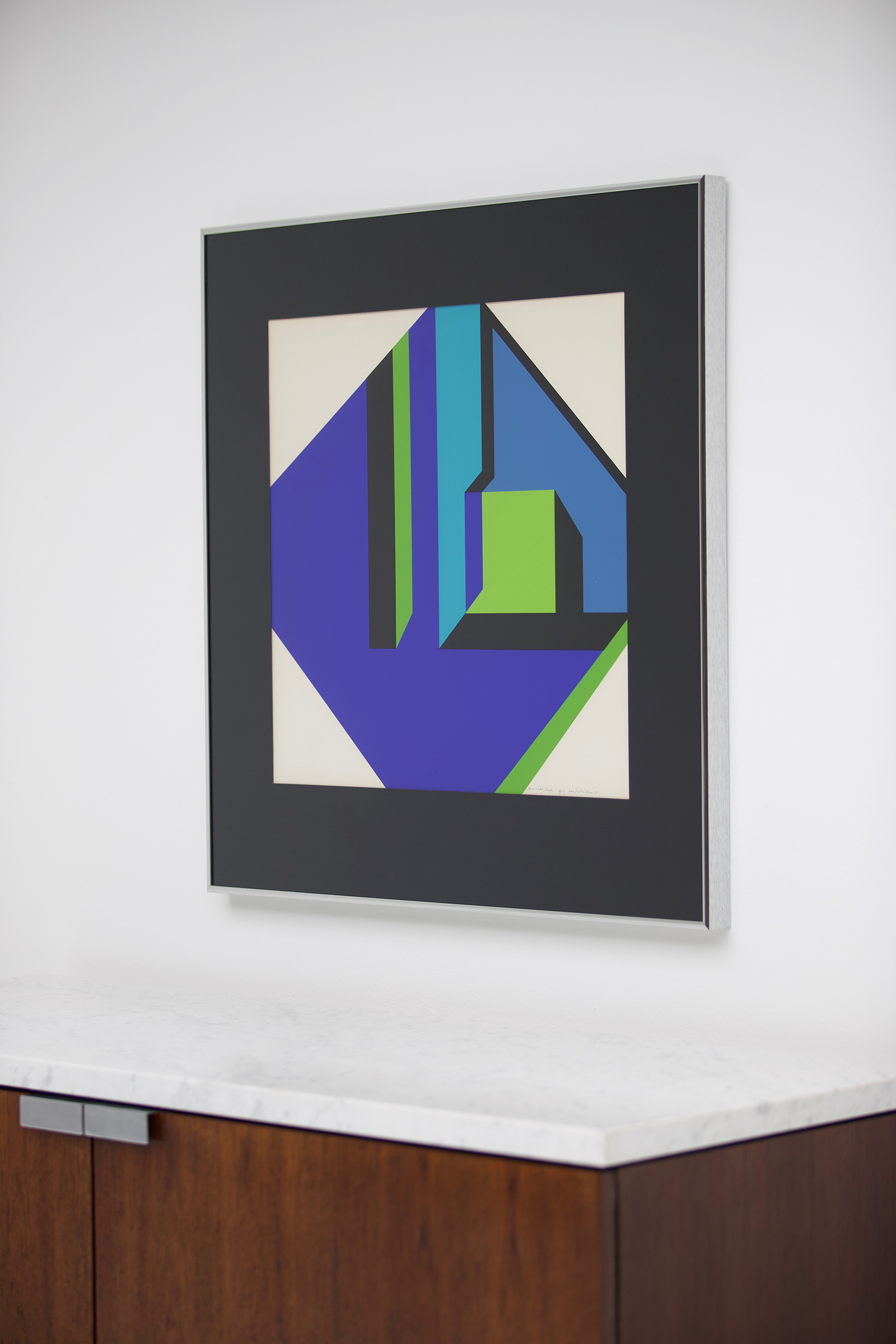 Impressive lithograph made by the hand of Belgian artist Guy Vandenbranden. The Antwerp based artist played an important role in the Belgian post-war art scene, belonging to the second generation of constructionists. Vandenbrandens work is a representation of geometrical abstraction and composition, a mixture of shapes, lines and colors. Next to his works on paper, he often painted on wooden panels that already showed a dimensional shape. This lithograph contains in an excellent condition and is signed and dated 1970. The lithograph has a new frame and passe partout.
