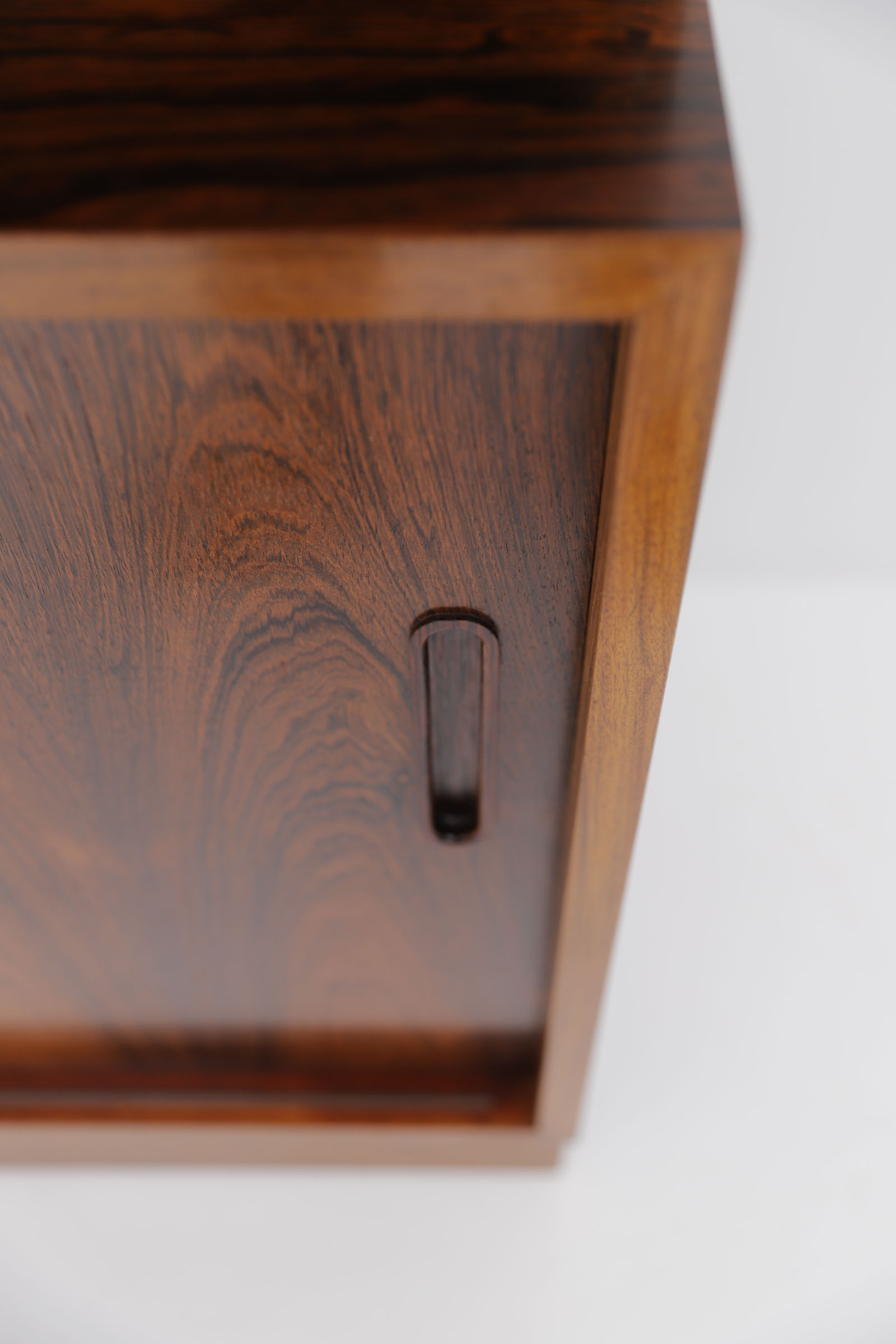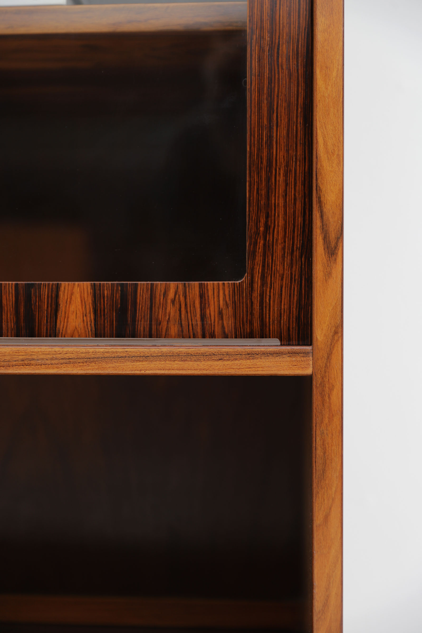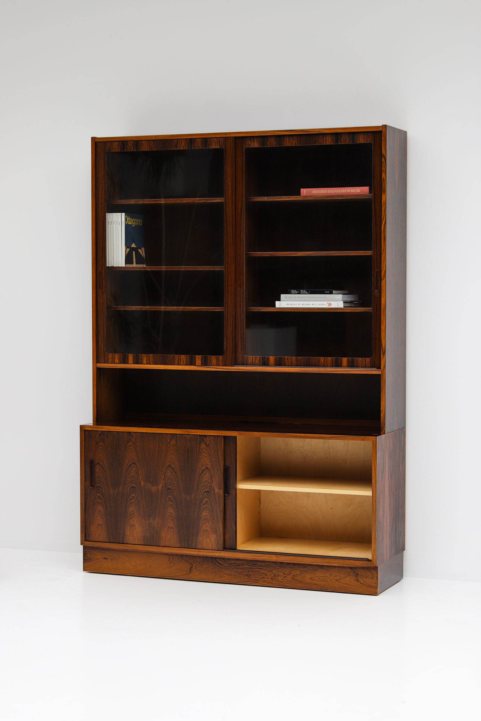 Elegant rosewood bookcase / cabinet designed by Erik Brouer for Mobelfabrik, Denmark 1960. The cabinet has two upper sliding glass doors and 2 lower sliding doors witch each lots of storage behind. The shelves inside are adjustable and attached by small metal hooks. The cabinet stands in an excellent condition.