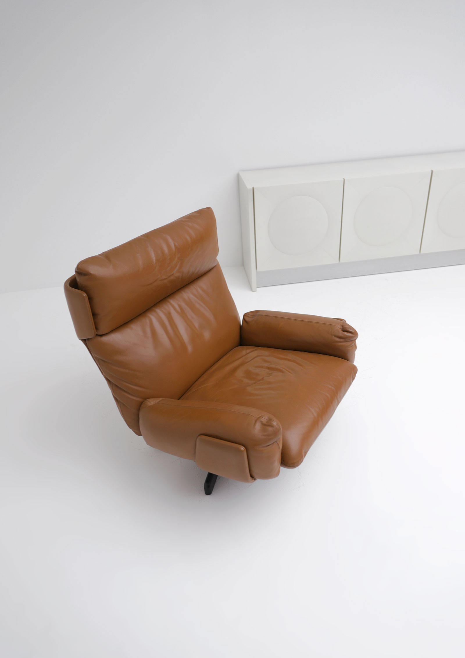 1970s charly lounge swivel chair designed by Heiner Gölz for Durlet. The chair has a cognac leather upholstery and a dark wooden leg. It was found in an architectural house from the 60s and a non smoking interior. The chair stands in an excellent condition.