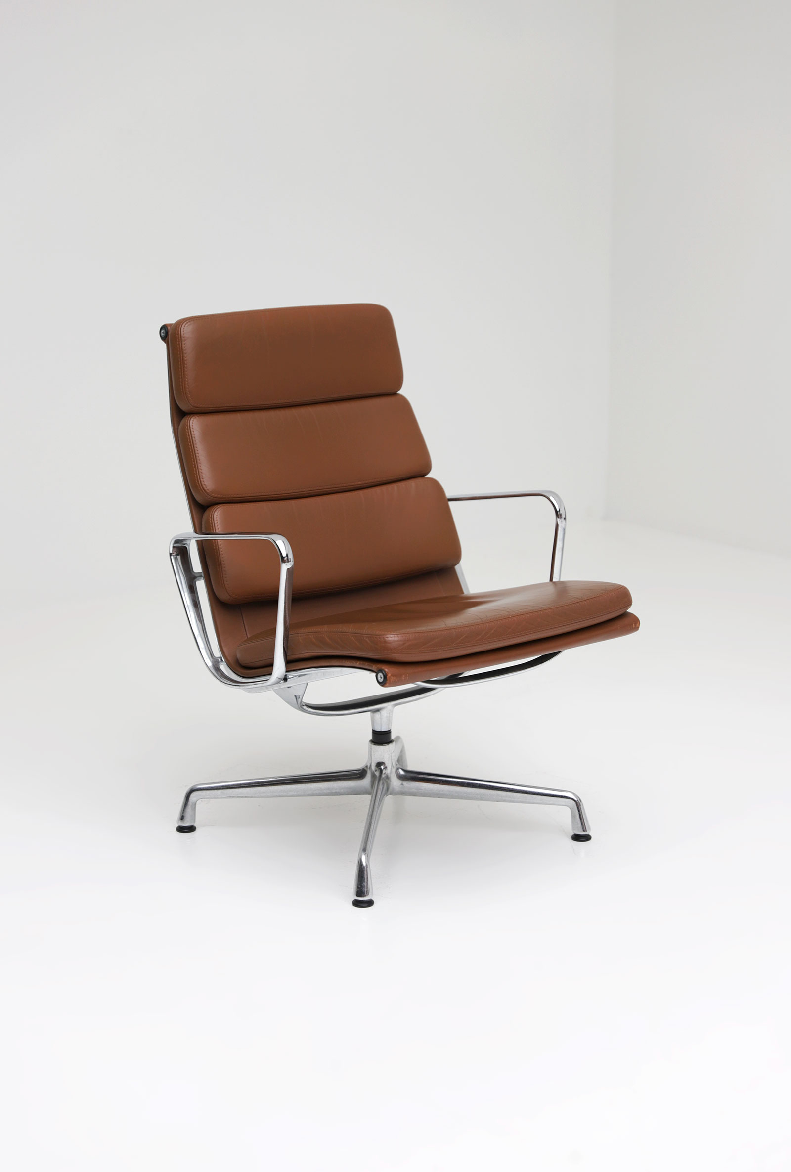 Office armchair with swivel seat, model EA216 designed by Charles & Ray Eames with chromed aluminium cast support and brown leather seats. This chair is a vitra edition dating from the 90s. Eight chairs are available all in a very good condition. 1600,- euro each.