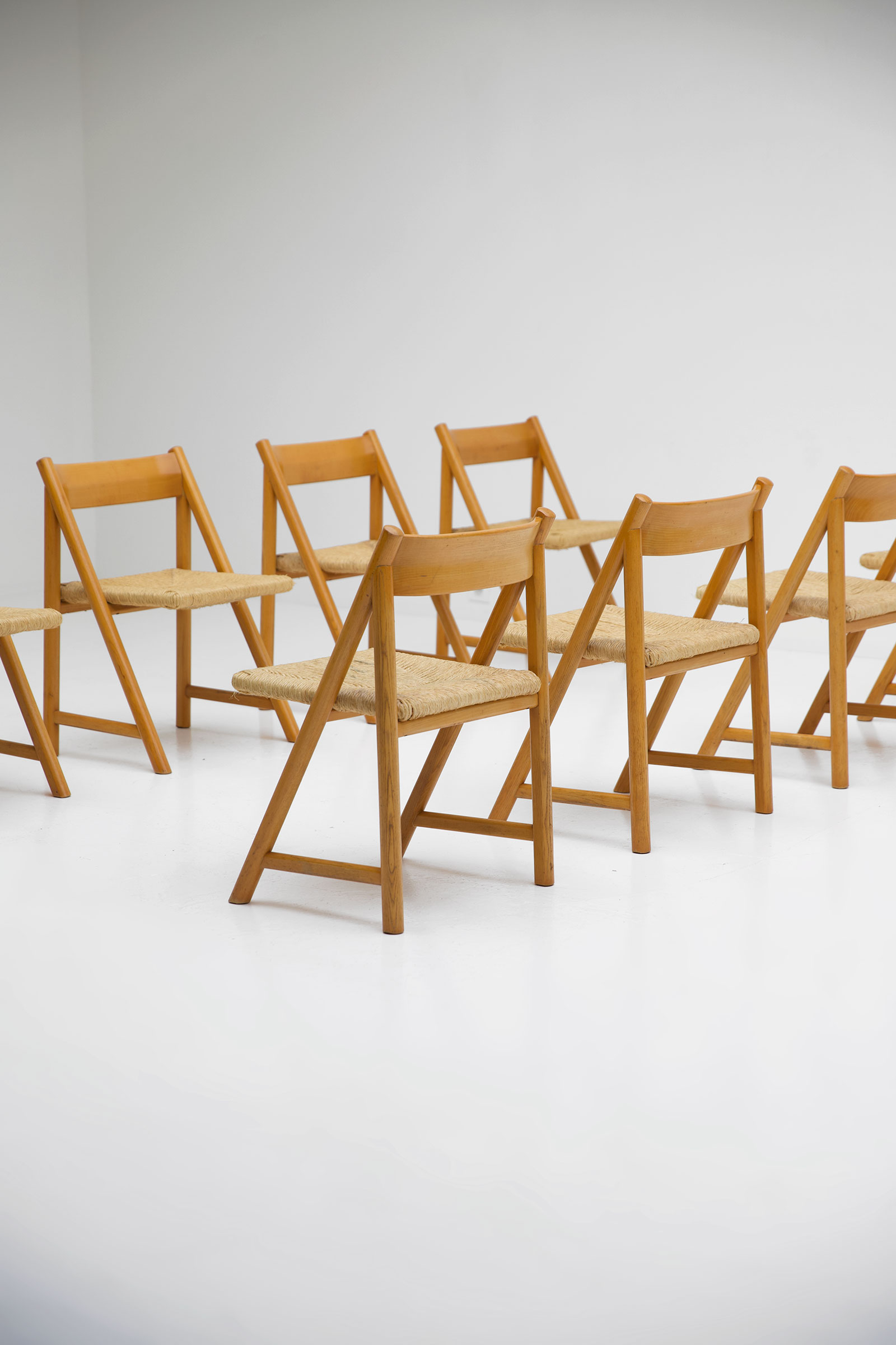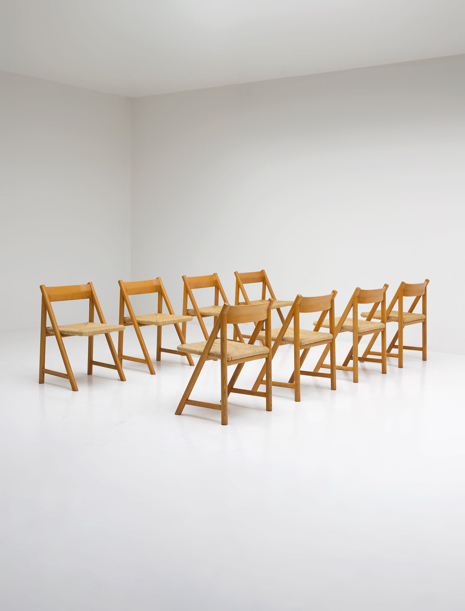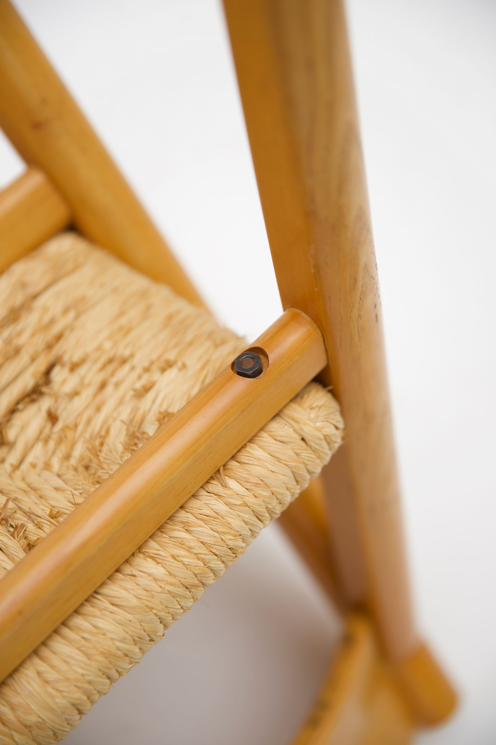 Set of 8 decorative dining chairs in beech wood with a rush seat. The chairs have a folding - shaped look, but are not foldable. The honey colored wood had gained a nice patina over the years. Underneath the seat you can find the original flat slot screws and blots. The set was found in an architectural house and dates back from the late 60s. So far, I could not find the designer or manufacturer.