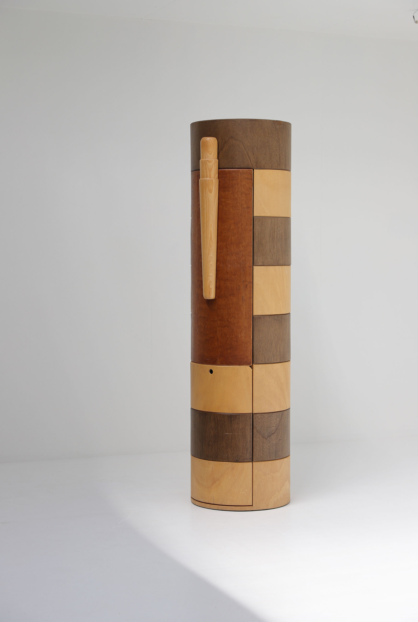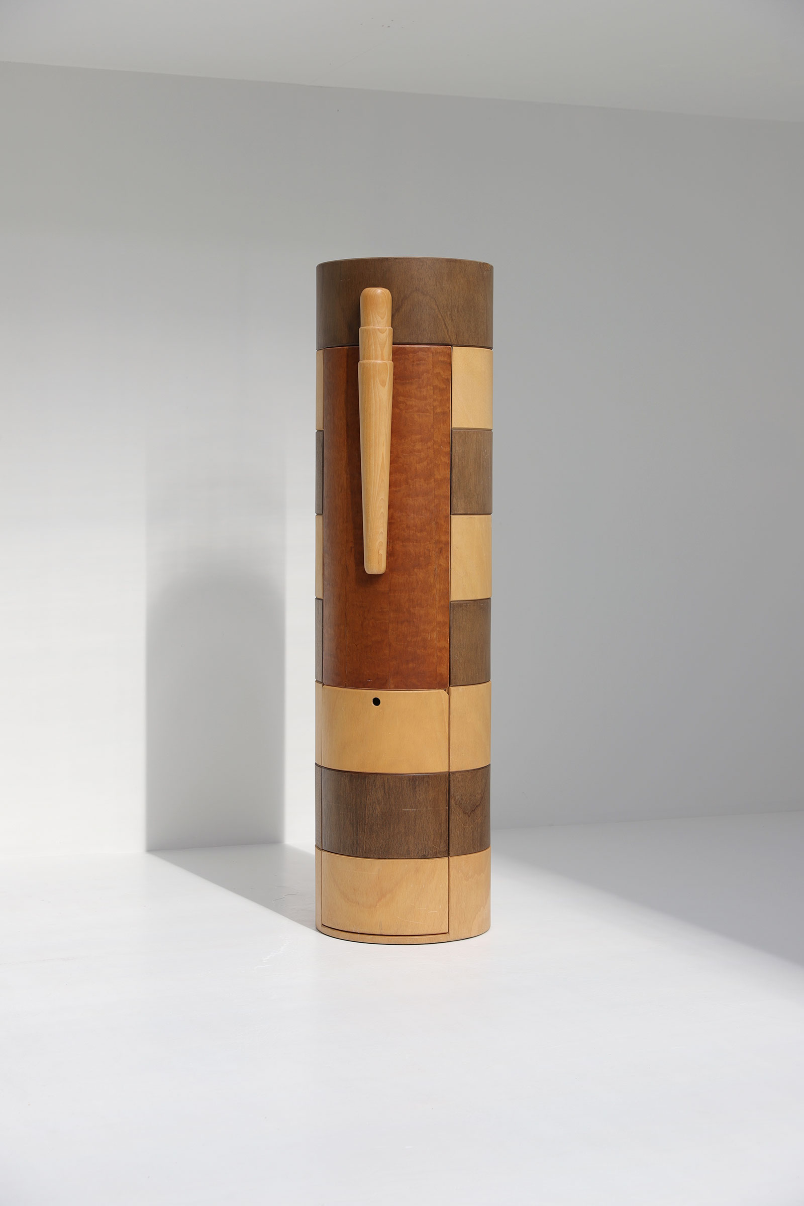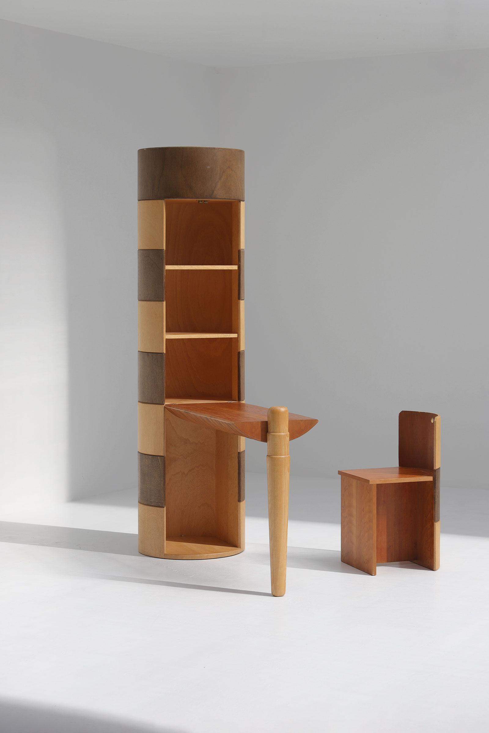 Rare and decorative totem with hidden desk and chair. This playful hidden writing desk is a unique find. So far, I could not find out the designer or the manufacturer, but it reminds me of the playful designs of the late 80s. This fun and inventive design is fully made out of wood. To take it in use, you first move out the chair and after fold out the desk. When open, the totem reveals shelves to storage books, toys or desk supplies. The Desk measures 76 cm high and 100 cm long, the chair measures 37with and 42 dept, seathight 45cm.