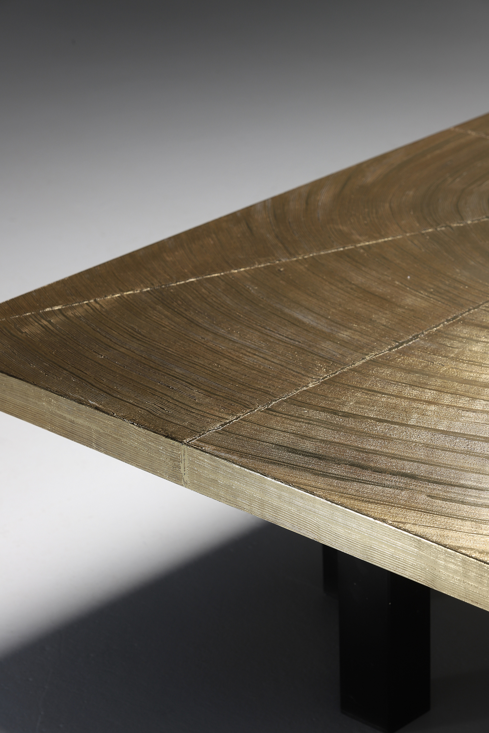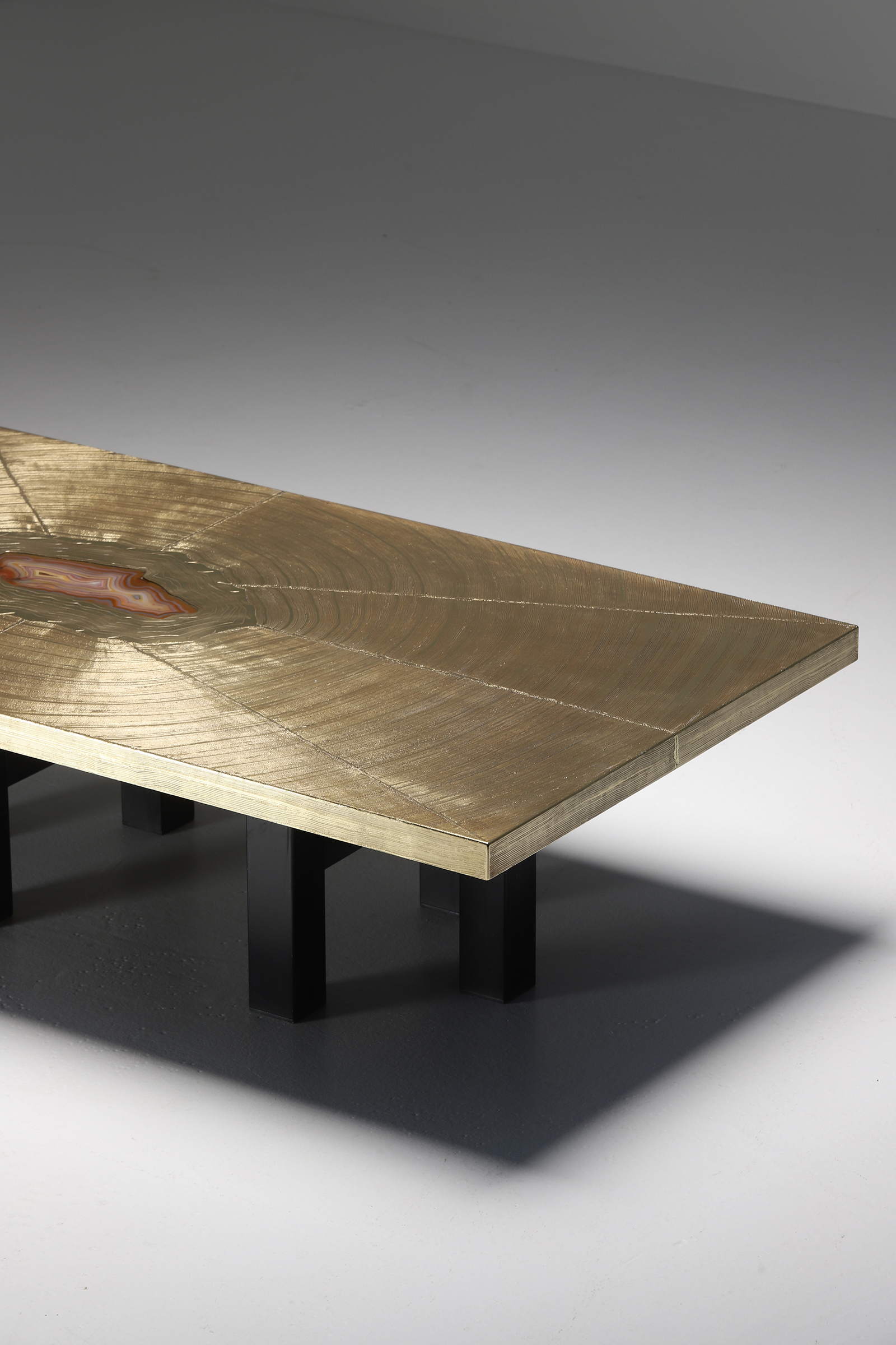 Belgium 1970s decorative coffee table by Lova Creation George Mathias . The table has an etched brass table top and is set on a black painted metal base. A warm red agate stone is placed in the center of the table and contrasts nicely with the golden shine of the brass. A highly decorative centerpiece that immediately gets your attention. Signed Lova Creation. The coffee table remains in a pristine condition and comes from the original owner.
