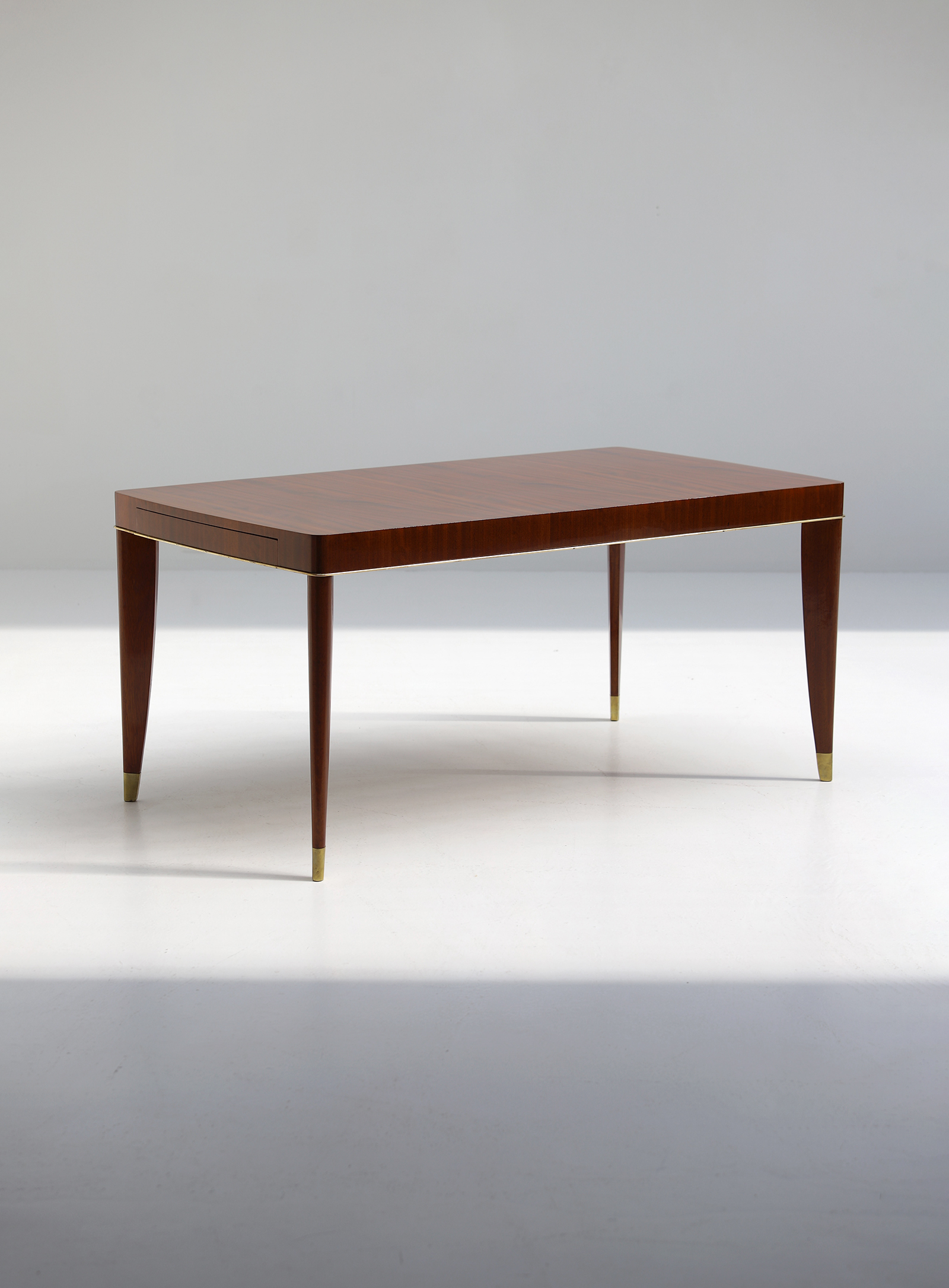 Mahogany dining table from the Voltaire series designed by De Coene, Kortijk. This high end classic furniture line was designed in the 1930s and produced until the 1960s on request. De Coene combined modern design with the production of high end classic furniture. Using the combination of pure Knoll design items and the classical furniture in their catalogs, emphasizes the character of such a range of furniture even more, especially when different styles are used in one interior. This dining table is from the Voltaire series, designed in the 1930s. It is made in Mahogany wood and has a brass line detail around the table's base and in the acutely shaped feet. The table is extendable on both sides and stands in a very good condition. The table is refinished in its original condition.