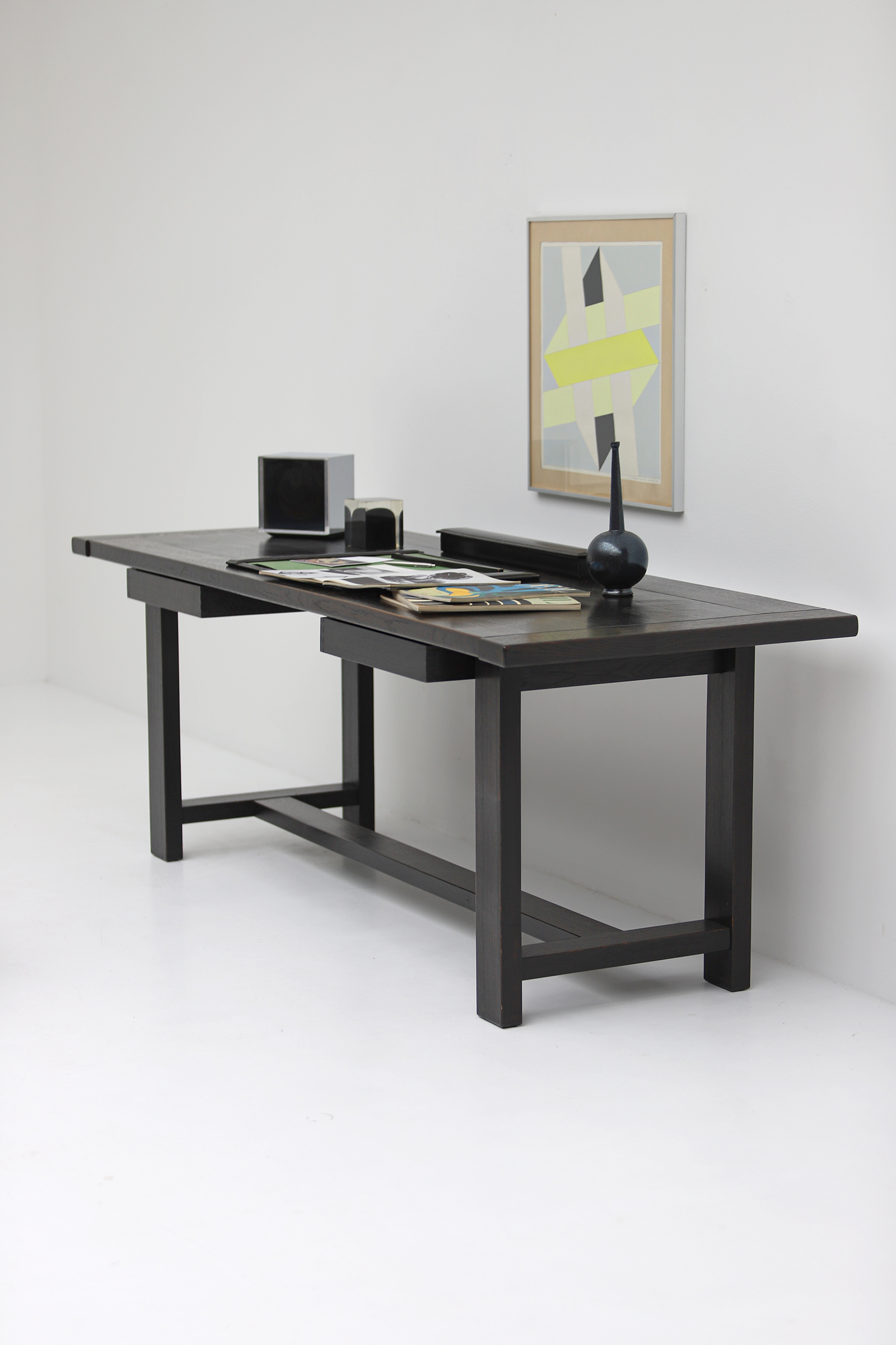 1969 Dining table / desk produced by Mi and designed by J. Batenburg. Mi is little known, but every find is a treasure. Their furniture shows craftsmanship and quality. This dining table can be used for different purposes. Its original a dining table and there can be 6 to 8 people seated at it, but it also can be used as a desk. 4 drawers are placed under the tabletop. Through the years, the table has aged nicely with a dark brown patina.