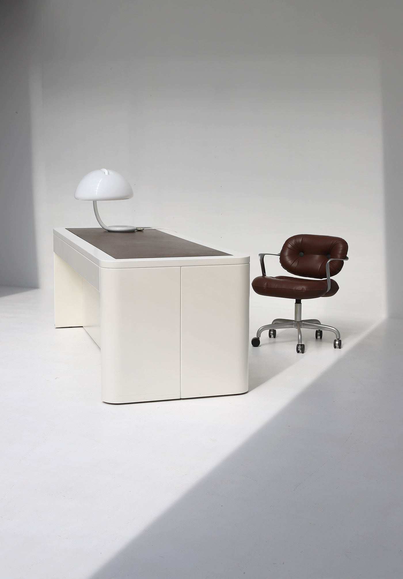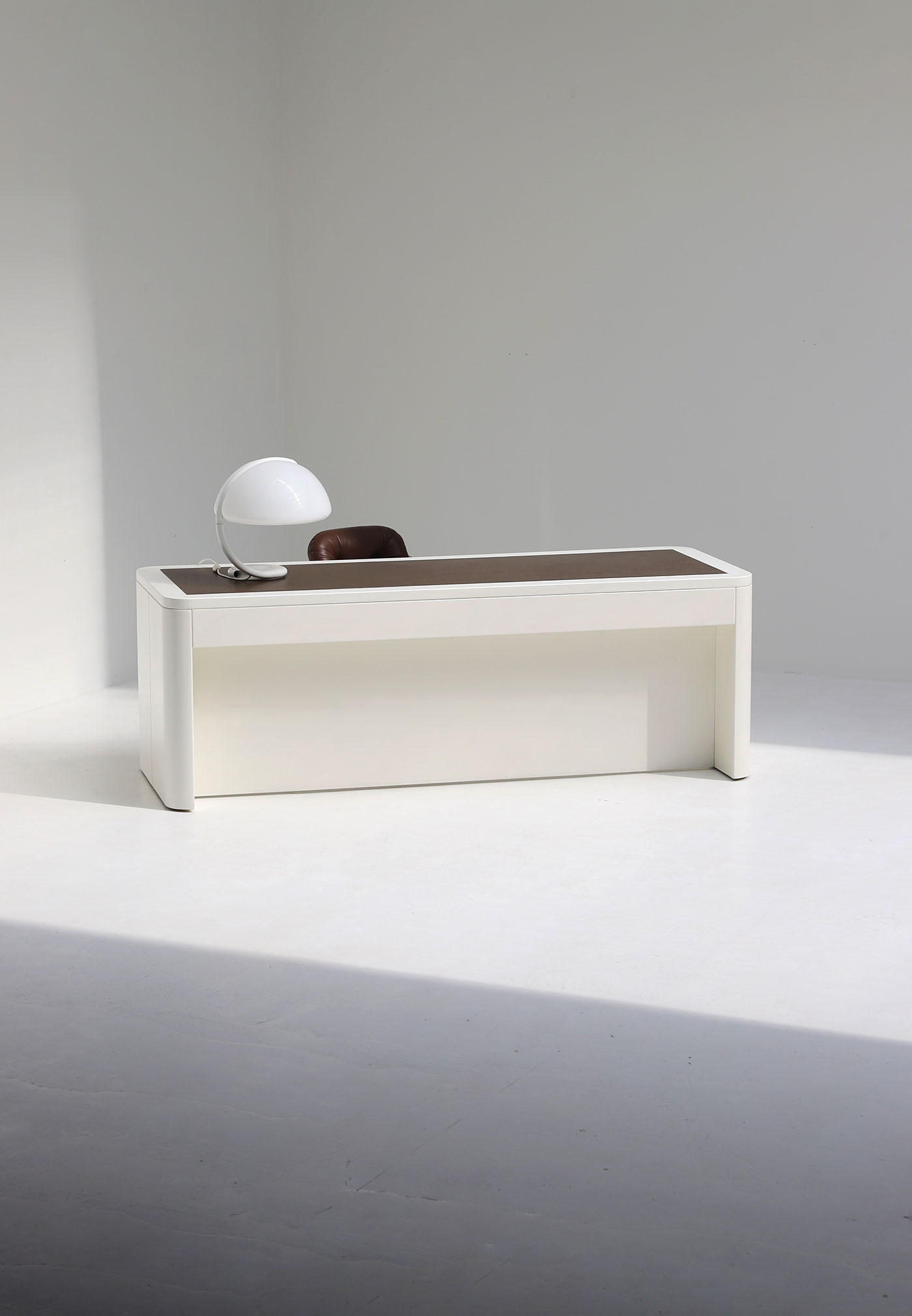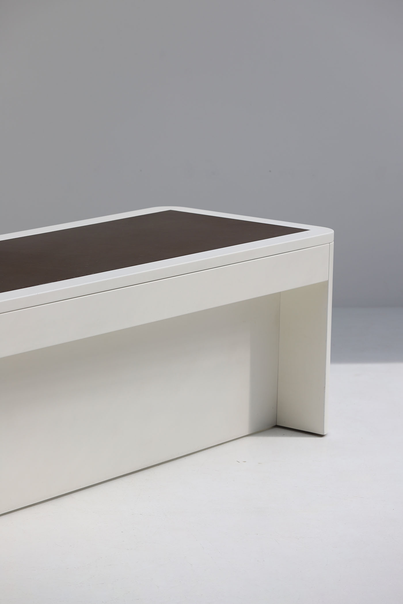 This large space age desk is dating is designed by Frank De Clercq in 1972. A minimalist yet modern design with a simple rectangular shape and rounded corners. The desk is build out of solid wood and plywood with a white lacquered finish. The desk top is covered with a dark brown leather. Stands in a good condition with some traces of usage normal to it's age.