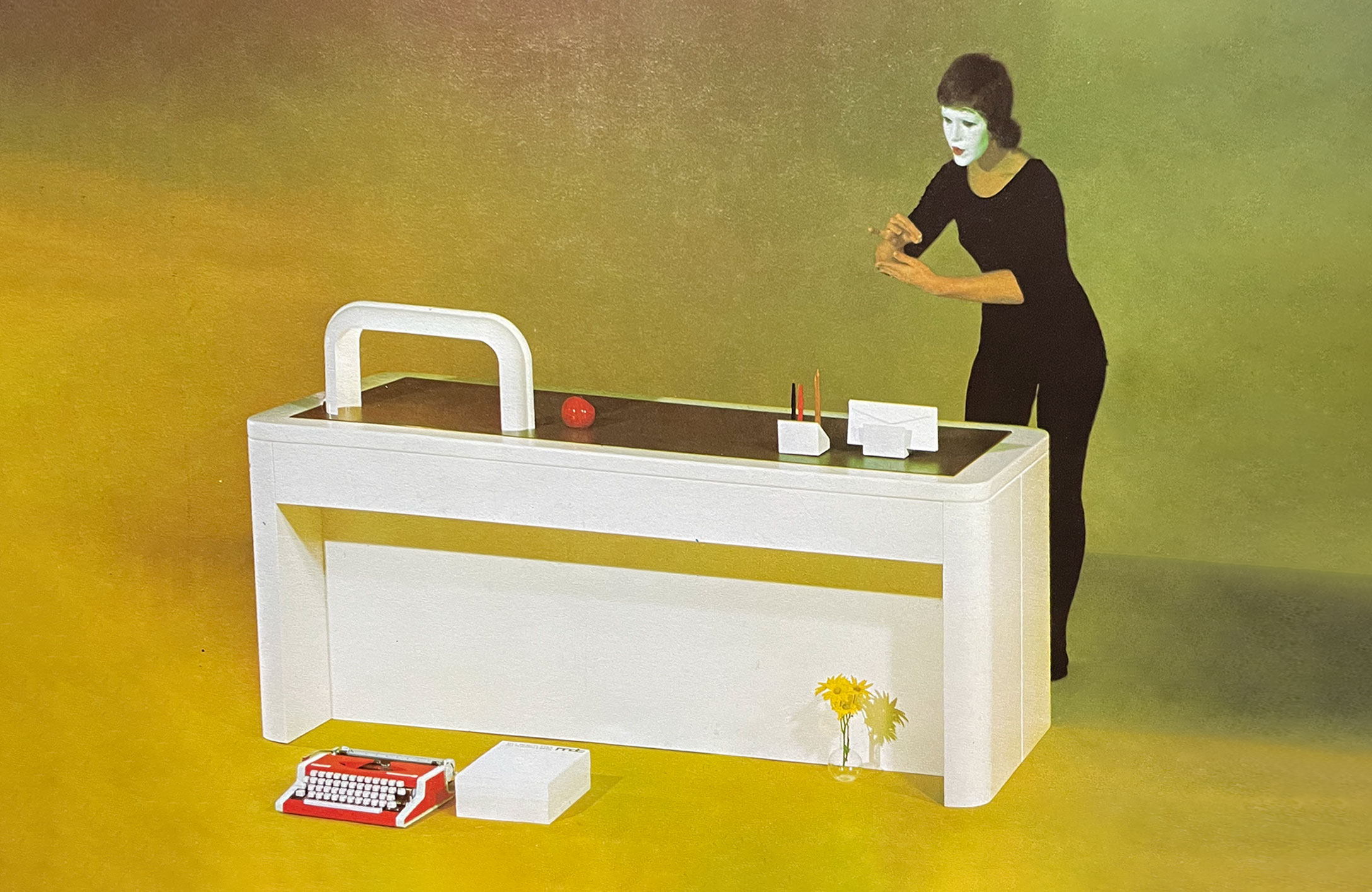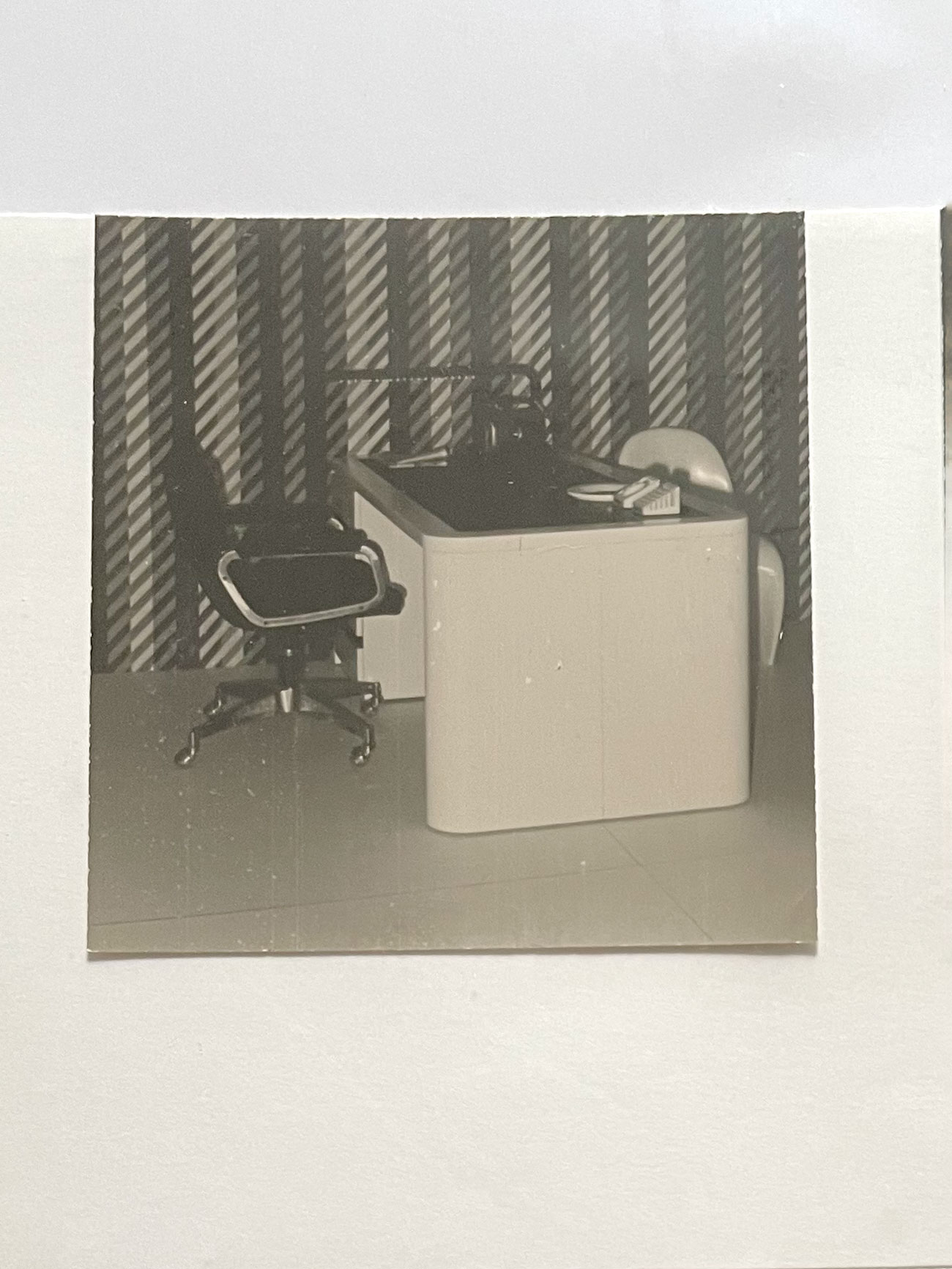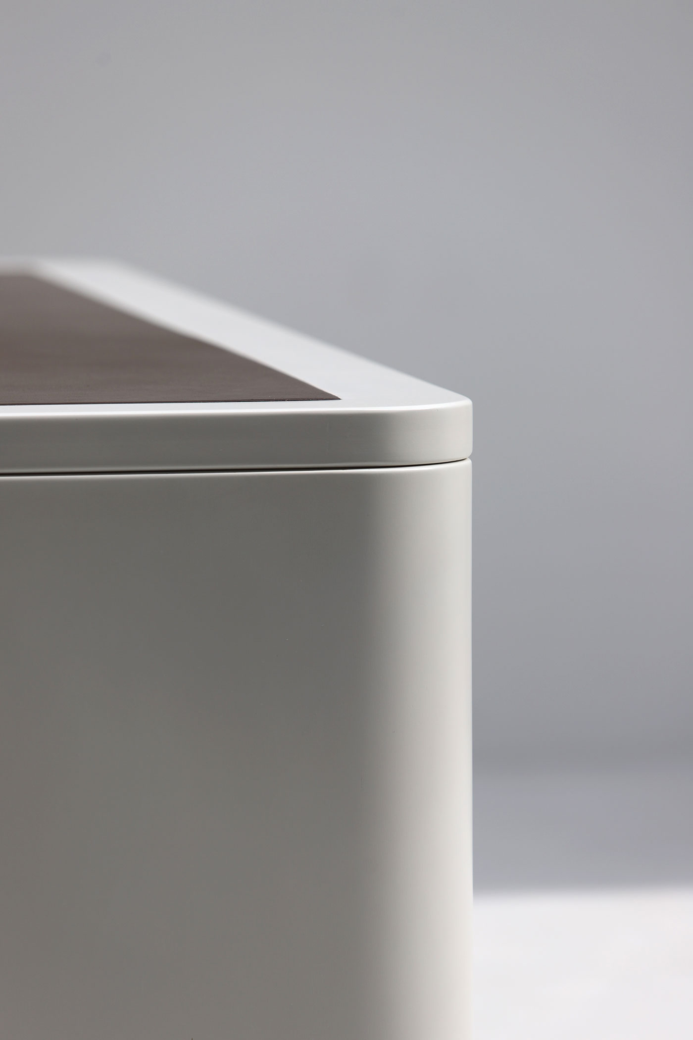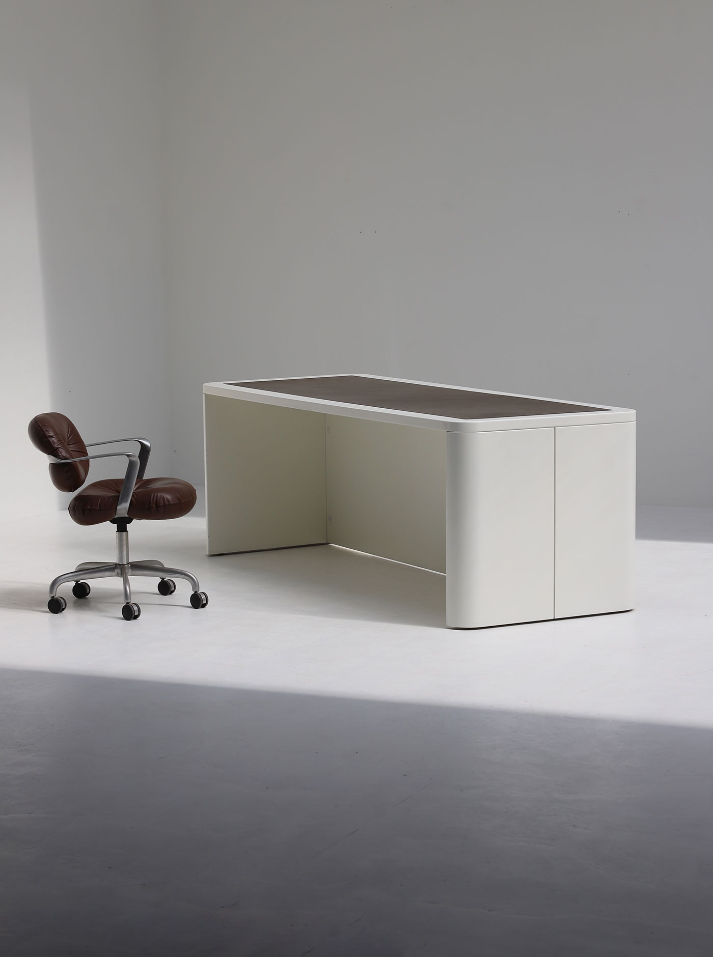 This large space age desk is dating is designed by Frank De Clercq in 1972. A minimalist yet modern design with a simple rectangular shape and rounded corners. The desk is build out of solid wood and plywood with a white lacquered finish. The desk top is covered with a dark brown leather. Stands in a good condition with some traces of usage normal to it's age.