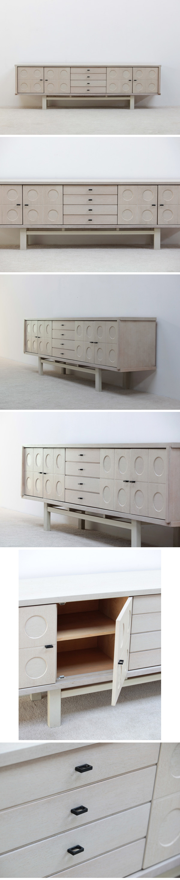 1970 Large full oak sideboard with graphic doors and inside a white ash veneer interior. This is the best one i had since i start selling these heavy weight sideboards. I all sold these beauties well and they did find there destinations around the world. It's for sure that they are Belgium made as i only find these sideboards in Belgium. They are well constructed and they do fit in any timeless design interior.